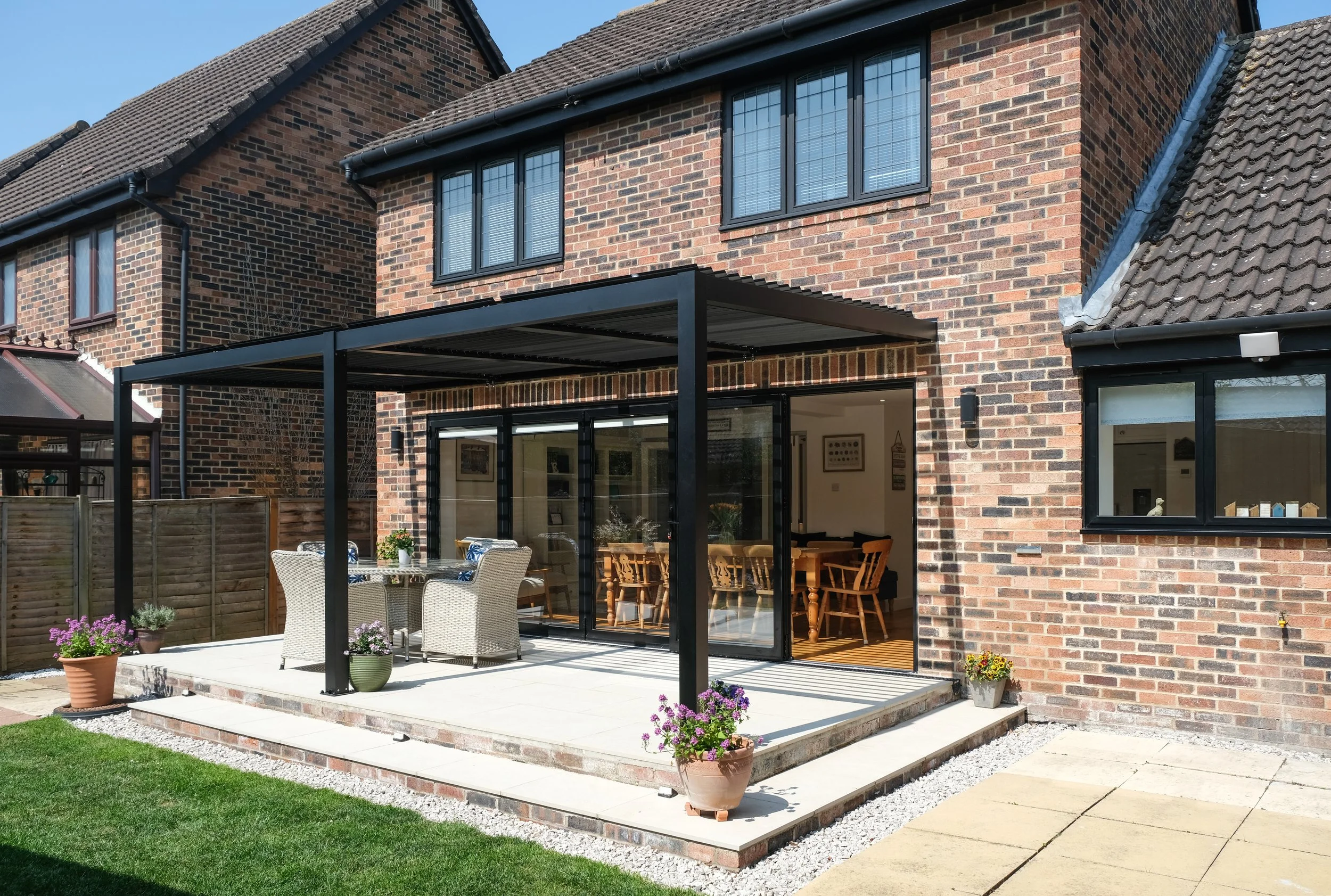 The removal of the outdated conservatory opened the rear elevation, allowing natural light to flood the main living spaces. The existing concrete base was repurposed as a new patio, complete with a aluminium pergola to create a comfortable outdoor entertaining area.